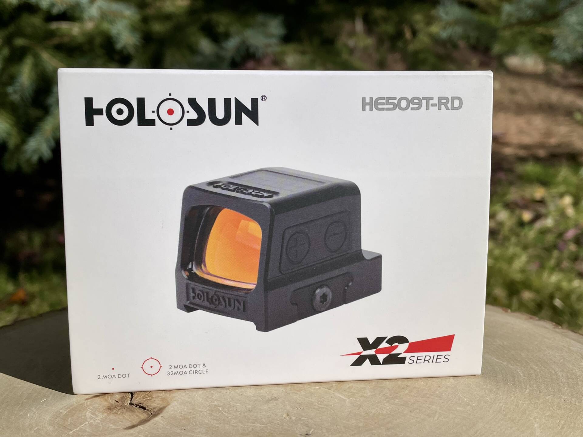 Details: Holosun HE509T-RD X2. Red circle / dot, and dot Reticle. Includes original packaging, mounting screws, Torx adjustment tool, lens cloth, and battery.